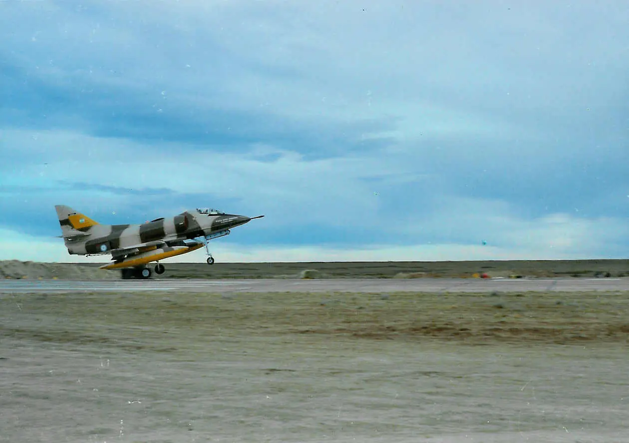 Armado y provisto de tanques de combustible suplementarios, este A-4C no identificado parte desde San Julian para alcanzar a la flota británica.
