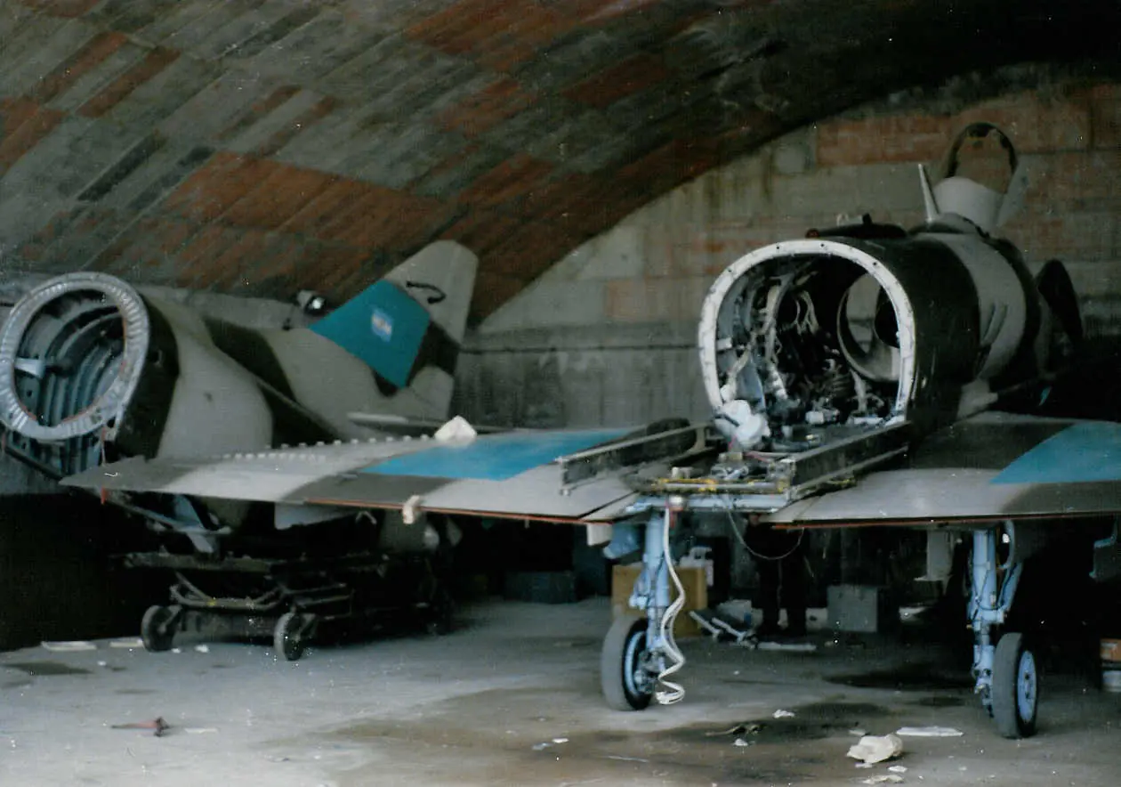 Un A-4C hangarado en San Julian y sometido a mantenimiento. Nótese que se le han extraído la parte trasera del fuselaje y el motor.