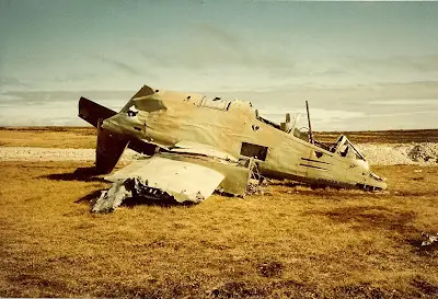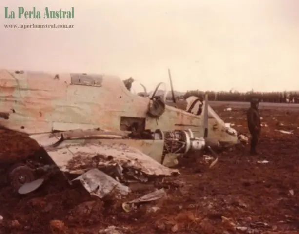 Restos de otro pucara estrellado. Los logros de estos aparatos fueron muy escasos y la mayoría fueron destruidos en tierra por los británicos.