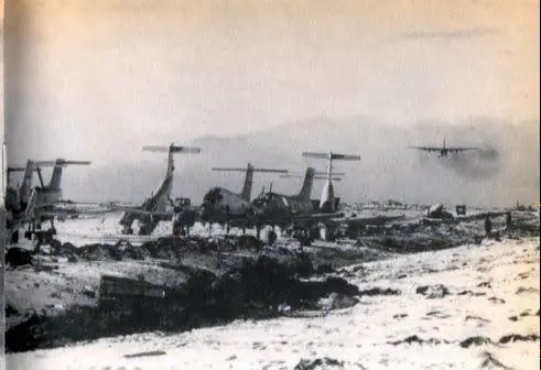 Triste foto en donde se aprecian varios Pucaras abandonados al costado de la Pista de Puerto Argentino, antes estos aparatos fueron dañados por ataques de Sea Harries y de comandos SAS en Pradera del Ganso y la Isla Borbón.