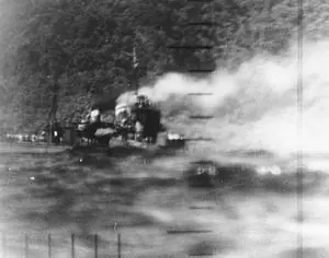 A finales de noviembre durante el transcurso de una misión a Buna, fue alcanzado en la proa por bombarderos B-17 que provocaron escasas víctimas pero le causaron una importante vía de agua que redujo su velocidad máxima a sólo 9 nudos. Tras las reparaciones de emergencia en Rabaul, Truk y Saipán, fue puesto en el dique seco en Sasebo en febrero del 43.