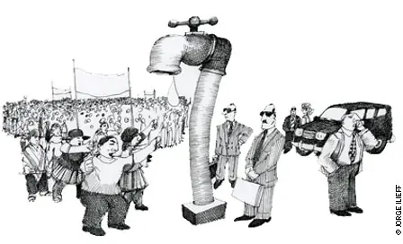 El Banco Mundial juega un papel clave, fomentando las privatizaciones prestando dinero para las reformas en el sistema de agua-, invirtiendo y finalmente como juez en caso de conflicto entre los inversionistas y los Estados. Mientras poblaciones no tienen acceso a la salubridad, grandes corporaciones venden agua pura embotellada para subsanar el mal. Entre 1970 y 2000, la venta del agua creció más de 80 veces. En 1970, se vendieron en el mundo mil millones de litros. En 2000, 84 mil millones. Las ganancias fueron de 2.2 mil millones de dólares.