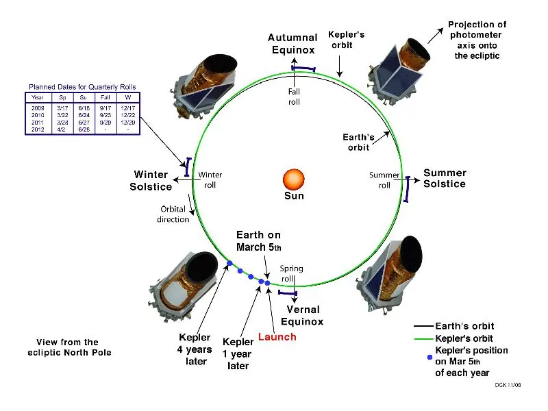 Kepler es un satélite, desde luego… pero no de la Tierra. Se encuentra orbitando el Sol, no nuestro planeta, aunque no demasiado lejos de nosotros. Su órbita es de 372 días, con lo que se mueve algo más lentamente que la Tierra y lo vamos dejando atrás en nuestra órbita poco a poco. La sonda dispone de hidracina para impulsarse y variar su orientación, de manera que a lo largo de cada órbita (más de un año, claro está) irá moviéndose siempre para mirar hacia Cisne/Lira todo el tiempo, observando las estrellas sin parar. En la siguiente imagen puedes ver su posición cada 5 de Marzo, cada vez un poco más retrasada respecto a la de nuestro planeta.