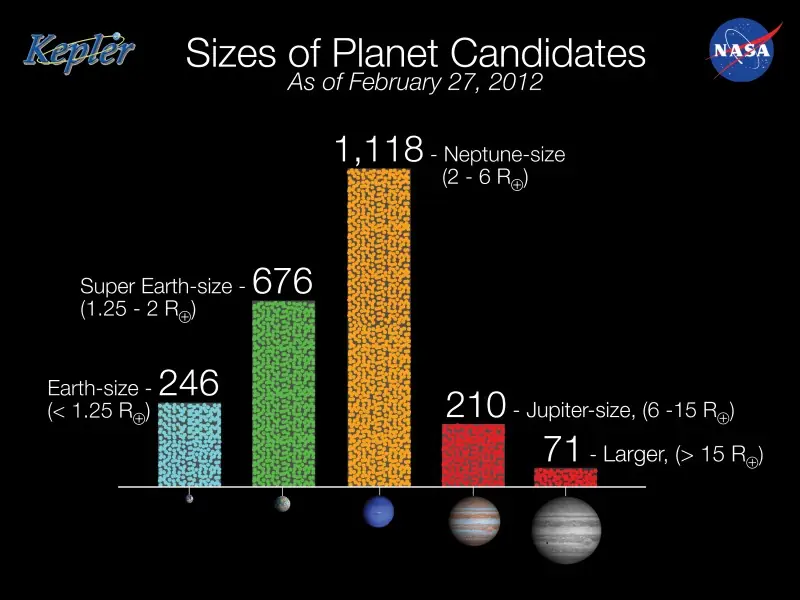 La cifra proviene del procesamiento de los datos recopilados desde mayo de 2009 a septiembre de 2010 donde se recopilaron cerca de 5.000 posibles tránsitos planetarios que fueron examinados para descartar fenómenos de efectos similares pero que nada tienen que ver con la presencia de un planeta. Con 2.321 candidatos, la distribución de los planetas muestra una mayor número con tamaños cercanos a la Tierra que planetas con tamaño cercano a Júpiter pero, en esta último lote, la tendencia se hace contraria y se han localizado más de 200 candidatos de tamaño similar a la Tierra y unos 900 de planetas algo más pequeños que una “súper-Tierra”, es decir, un planeta con diámetro doble al de la Tierra (12.756 kilómetros) pero, en términos generales, los exoplanetas detectados son de tamaño mayor al de nuestro planeta.