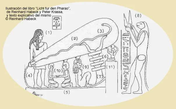 1 – Experto sacerdotal egipcio. 2 – Vapor ionizado o gas 3 – Serpiente estilizada, interpretación pictórica de una descarga eléctrica. 4 – Flor de loto (¿un enchufe?) desde cuya extremidad se origina un arco voltaico. Este hecho es mostrado físicamente de manera correcta porque aquí el campo de energía eléctrica muestra la tensión más alta. 5 – Cable de conexión 6 – Shu, Dios del Aire 7 – “Djed-pilar”; tiene la función de un aislador 8 – Thot – Dios de la Ciencia , sosteniendo un par de cuchillos. ¿Una referencia al peligro que acecha en el aparato representado?. 9 - ¿Un simbolismo para la “tensión”?. 10 – Polaridad; la figura que denota el polo positivo 11 – Caja que contiene el generador.