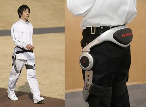 Honda ha lanzado su “Dispositivo de asistencia al caminar”. El exoesqueleto está diseñado para reducir la carga en los músculos de las piernas y en las articulaciones (en la cadera, las rodillas y tobillos) suportando una parte del peso del usuario. Actúa como un exoesqueleto con correas sobre la ropa del usuario y ofrece dos piernas artificiales que se ajusten al lado de las propias piernas del usuario.