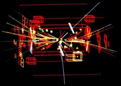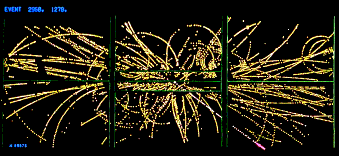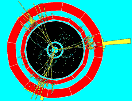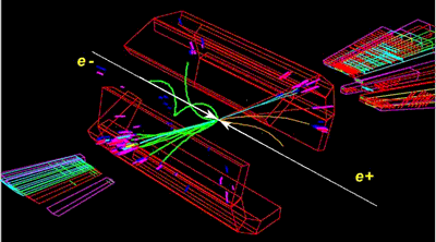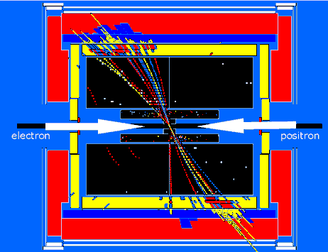La siguiente imagen muestra la reconstrucción de un suceso producido en el detector ALEPH del acelerador LEP, en el laboratorio europeo de Física de Partículas, CERN, donde chocaron frontalmente un electrón (e–) y un positrón (e+).