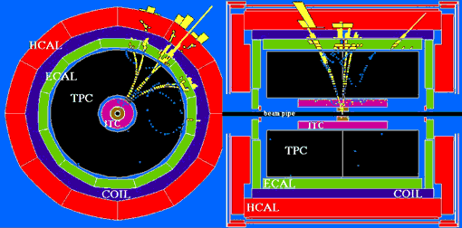 Estos detectores suelen ser cilindros a lo largo de cuyo eje circulan las partículas. La figura siguiente muestra dos cortes del detector y la reconstrucción (más o menos en las dos vistas correspondientes) del resultado de una colisión entre un electrón y un positrón en el centro del detector. Cada línea corresponde a la trayectoria de una partícula.