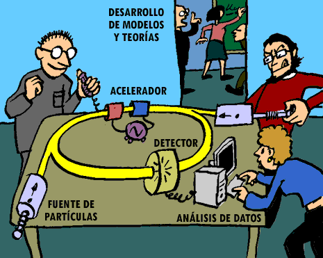 Esta figura trata de resumir los métodos de trabajo de los físicos de partículas. Algunos de ellos hacen experimentos en aceleradores y detectores, otros se dedican a tratar e interpretar los datos, otros se dedican a construir modelos y teorías... En el mundo real, estas distinciones no son claras; no hay experimento sin teoría, los teóricos no pueden ni quieren vivir aislados ni son todos “puros”, etc.