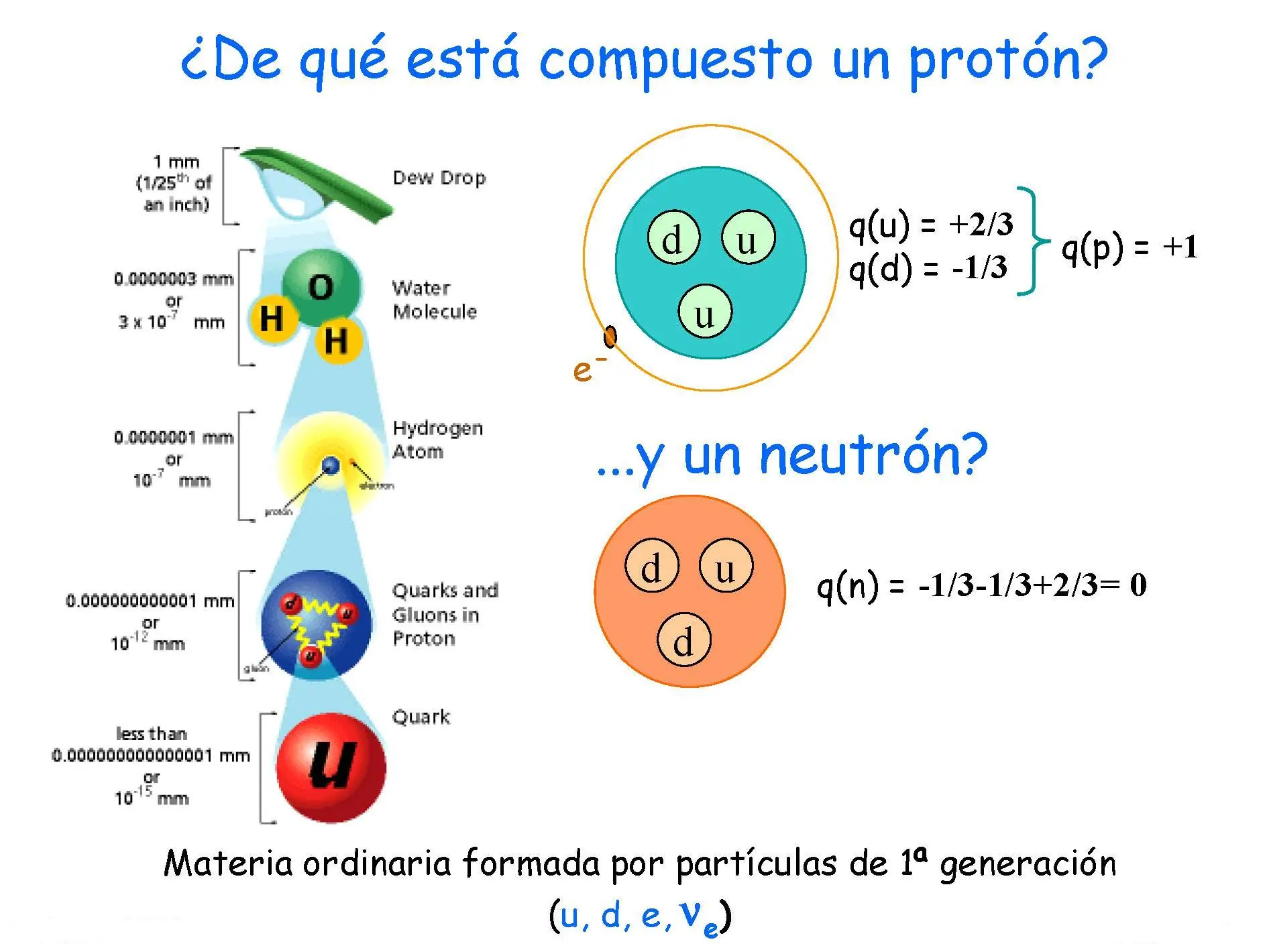 El protón está compuesto por tres quarks que se mantienen unidos intercambiando constantemente gluones; si además hay un electrón ligado al protón por el intercambio de fotones, el resultado es un átomo de hidrógeno. (¡No está a escala!)