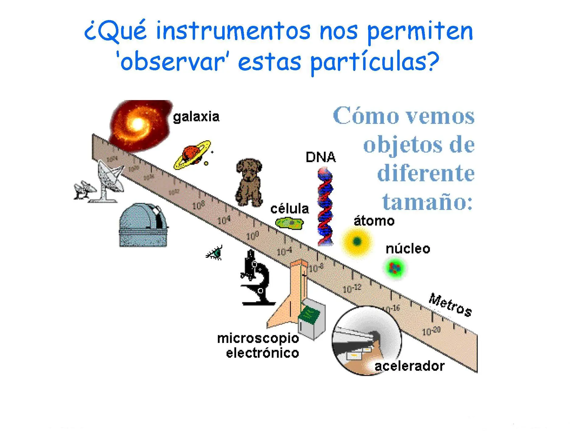La siguiente tabla, tomada de La Partícula Divina. Si el Universo es la respuesta, cuál es la pregunta (de Leon Lederman y Dick Teresi, Crítica, Barcelona, 1996), muestra la energía aproximada que hace falta para poder penetrar en algunas estructuras interesantes:
