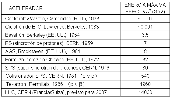 Si hacemos una lista ordenada cronológicamente de los principales aceleradores de protones (y a veces antiprotones o núcleos), notaremos rápidamente una clara tendencia: