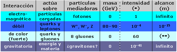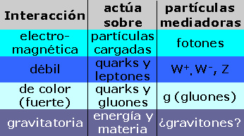 Los campos cuánticos responsables de las interacciones y sus correspondientes cuantos (con spin 1 salvo el hipotético gravitón, que tendría spin 2) son:
