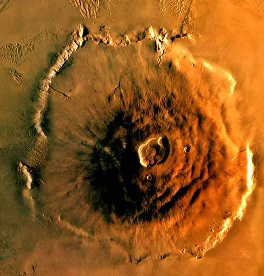 El volcán más grande conocido de nuestro sistema solar es el Olympus Mons (Monte Olimpo). Se encuentra en Marte, se eleva a unos 25km sobre la superficie Marciana y su base mide unos 283.000km.