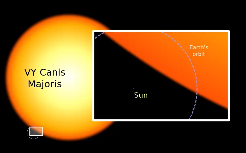 la estrella mas grande del universo conocido se llama VY Canis Majoris,es 2100 mas grande que nuestro sol,si la suplantaramos por el sol,esta estrella llegaria hasta saturno.