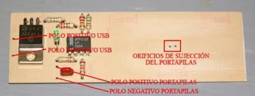 Cuando tengamos el montaje del circuito listo, solo nos quedará incorporar el portapilas y el cable del USB. En la siguiente imagen podéis ver donde ira colocado cada cable: