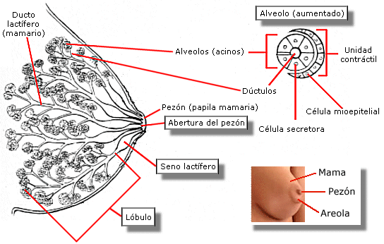 Cada teta, cuyo aspecto exterior es una prominencia de tamaño y turgencia variables, posee ciertas estructuras tanto externas e internas, iniciando por las del exterior en donde se puede visualizar el pezón y la areola. Internamente la mama posee gran cantidad de tejido adiposo, que la constituye en un 90% dándole forma abultada, además se integran al tejido los conductos galactóforos y la glándula mamaria, encargados ambos de la producción y secreción de leche materna. Las glándulas mamarias se distribuyen por todo el seno, aunque las dos terceras partes del tejido glandular se encuentran en los 30 mm más cercanos a la base del pezón.1 Estas glándulas drenan en el pezón por medio de ductos, cada uno de los cuales tiene su propia apertura o poro. La intrincada red formada por los ductos se ordena de forma radial y converge en el pezón. Sin embargo los ductos más próximos a éste no actúan como reservorios de leche.
