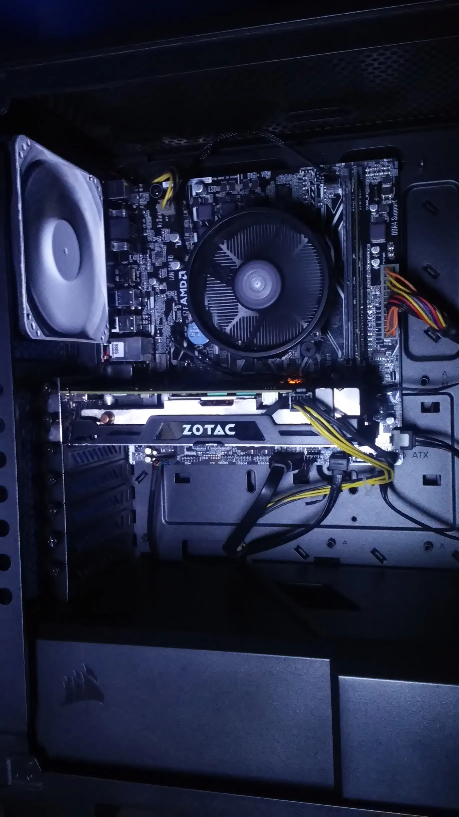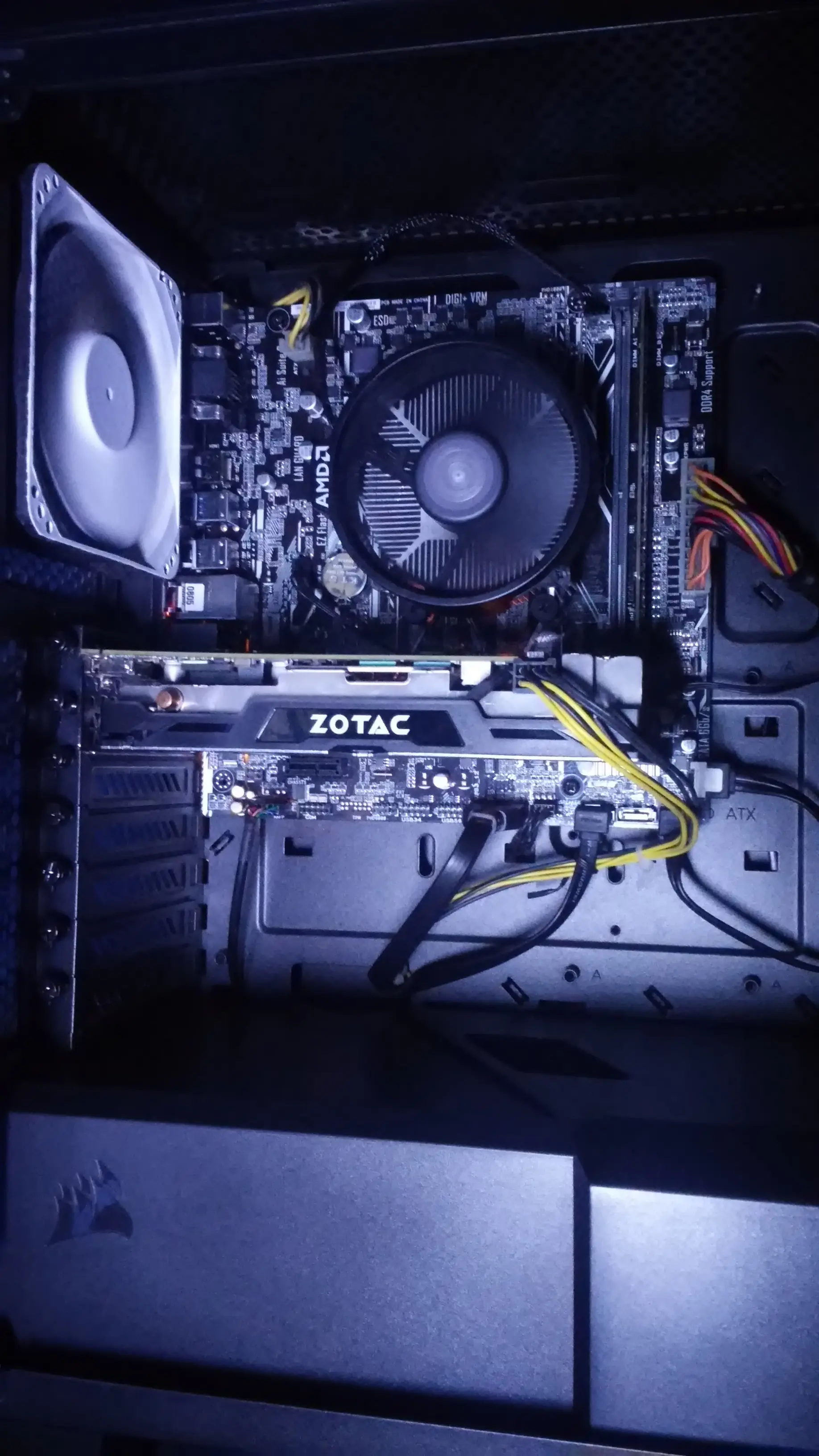 Y ustedes dirán "1600 con un chipster A320?" y yo les diré "SI", no soy de hacer oc, por lo general compro componentes que rindan si necesidad de estar mandando mano y esta no es la excepción, por algo siempre que compre Intel fueron micros no K, y como uno tiene que comprar en función de los gustos de uno y no de lo que harían los demás... me fui por esa mother que por cierto es muy linda con su pcb negro y detalles en blanco, ademas de un detalle que no me esperaba como los leds en la parte trasera que rebotan en la chapa del gabinete iluminando un poco la zona (no se ve en las fotos por que el flash de frente lo minimiza) y otro led en la traba del puerto pci espres x16 que se puede ver en la imagen de abajo donde parece que se esta prendiendo fuego la 1060 AMP.