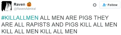 Sólo hace falta ver cualquier manifestación de hoy en día y van a ver carteles como: Maten a todos los hombres. Sí, adivina que pasa si un hombre hace eso respecto a las mujeres... sí, va a la cárcel.