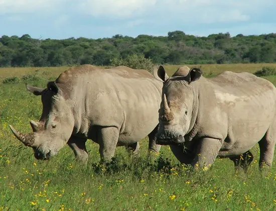 Uno de los animales mas grandes de Africa, junto con el elefante y los hipopotamos. Machos y hembras muestran dos caracteristicos cuernos sobre la nariz. Curiosamente estos cuernos no estan conformados por hueso sino que son un conjunto de pelos queratinosos aglutinados de gran dureza. Existen dos especies de rinocerontes en Africa. El blanco de mayor tamaño y mas pacifico y el negro, de menores dimensiones y mas malhumorado. No se diferencian por el color (Ambos son grises) sino por sus labios superiores. El blanco pose un labio ancho y plano para comer hierba y el negro, un labio triangular y prencil ideal para comer hojas. El nombre de blanco y negro viene de una confusion linguistica. La palabra Widht (Ancho) puesta por los boers holandeses en referencia al labio del primero, fue confundida con la palabra "White" (Blanco) por los ingleses que llegaron al Cabo, dando lugar a los actuales nombres