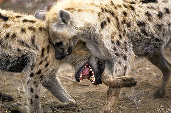 Son excelentes y valientes cazadoras que pueden derribar grandes animales e incluso plantar cara a sus principales rivales, los leones. Sus mandibulas son unas de las mas fuertes del mundo animal, siendo capaces de triturar grandes huesos con una facilidad asombrosa. Viven en manadas estructuradas, lideradas por hembras. Las hienas hembras tienen mas hormonas masculinas que los machos, lo que las hace mas grandes y agresivas. Incluso muestran un clitoris tan desarrollado como el pene de los machos lo que llevo a los cientificos de la epoca a pensar que eran seres hermaforditas.