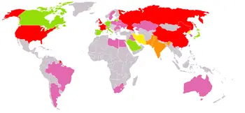 ROJO: Los cinco países con armas nucleares del NPT (Tratado de no proliferacion de armas nucleares).