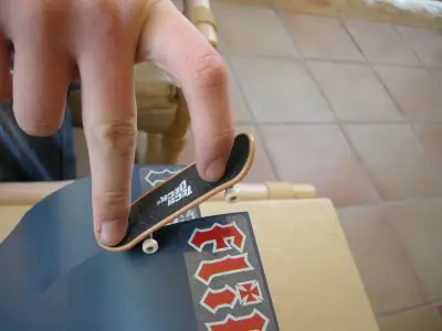 -Kickflip: Significa que el fingerboard da una vuelta horizontal hacia ti, (es necesario saber hacer un Ollie) , la forma de conseguirlo es que con el dedo trasero hagas presión haciendo un Ollie y el dedo delantero tiene que ponerse atrás de los tornillos delanteros en la parte delantera de la tabla (nose), luego con el dedo delantero desvías la trayectoria del Ollie haciendo que de una vuelta horizontal hacia tu cuerpo.