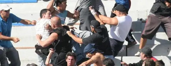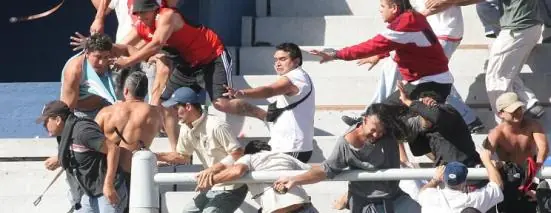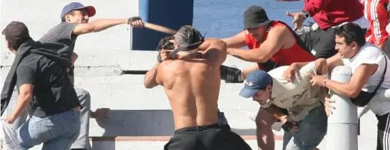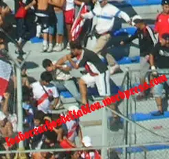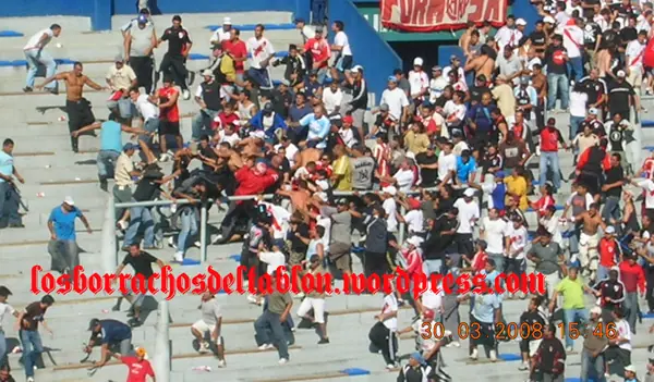 Estaba claro que eran de La Banda del Oeste y que la cuestión iba a ser complicada, ya que de ese supuesto “acuerdo” de que ellos iban a ir de visitante y lo que podríamos llamar La Banda de Gonzalo (ex partidarios de Adrián) alentarían de local, no quedó nada ya que los del Oeste no habían aparecido ni en La Plata ni contra velez, mientras que La Banda de Gonzalo ya se identificaba con trapo propio, más otros y los bombos, dando la apariencia de haberse consolidado como la dominante y en paz. Hasta hoy.Casi una hora después (15.46) entraron caminando pero con paso decidido unos 80 a 100 barras directamente a buscarlos, cinturones y cadenas en mano. Fue una batalla campal que no duró más de 3 0 4 minutos. Las imágenes hablan por sí solas: