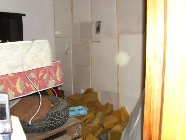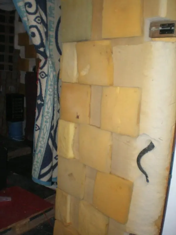 Ya casi terminamos, falta poco. Ahora viene la puerta, esencial porque es el punto que mas interacción tiene con el exterior, usamos un colchón viejo y lo cortamos para que calce perfecto en la puerta y que quede lo mas hermético posible, agregamos unas trancas para portones y calamos el marco de la puerta para que se pueda cerrar, queda perfecto, cierra bien y no deja escapar el sonido, cumple su propósito.