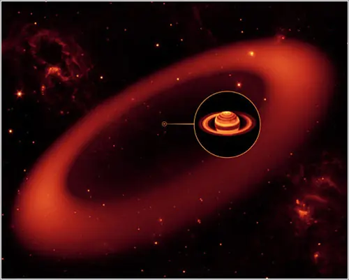 Explorando el lado oscuro de una luna de Saturno (como quien explora el subconciente interplanetario) científicos de la NASA descubrieron un espectral anillo gigante. Este fantasma de polvo y hielo inicia su imperial aureola a 6 millones de kilómeteros distancia de Saturno y se extiende por otros 6 millones de kilómetros más haciéndolo el anillo más grande del sistema solar. Dentro de él cabrían mil millones de Tierras.