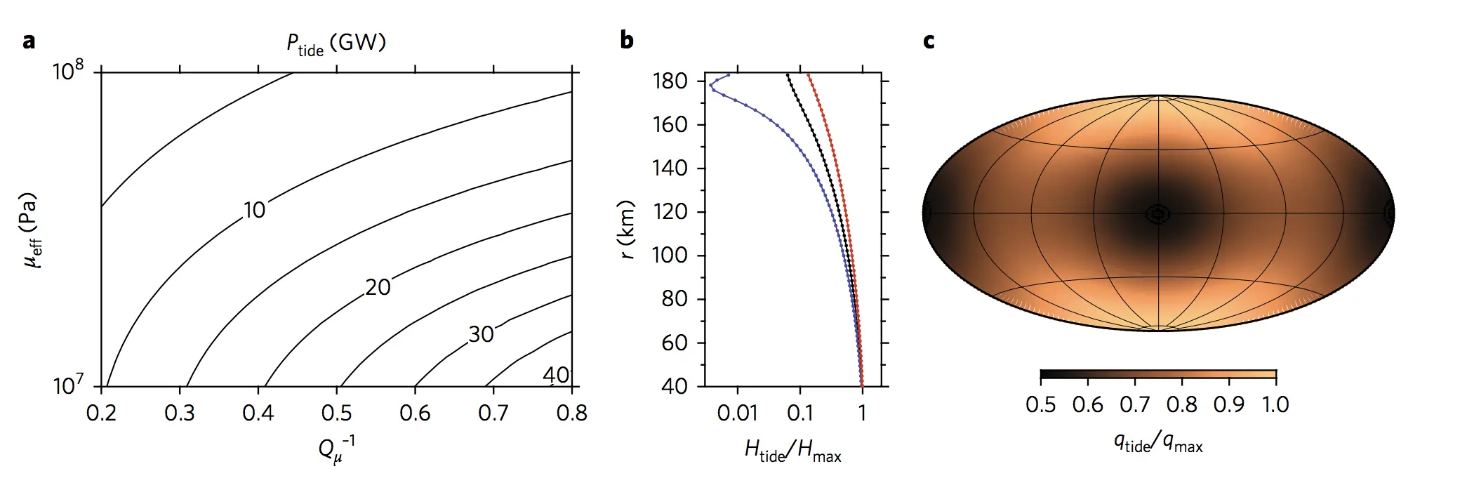 Fricción de marea en el núcleo poroso de Encélado saturado con agua. En c) vemos la distribución espacial del flujo de calor.