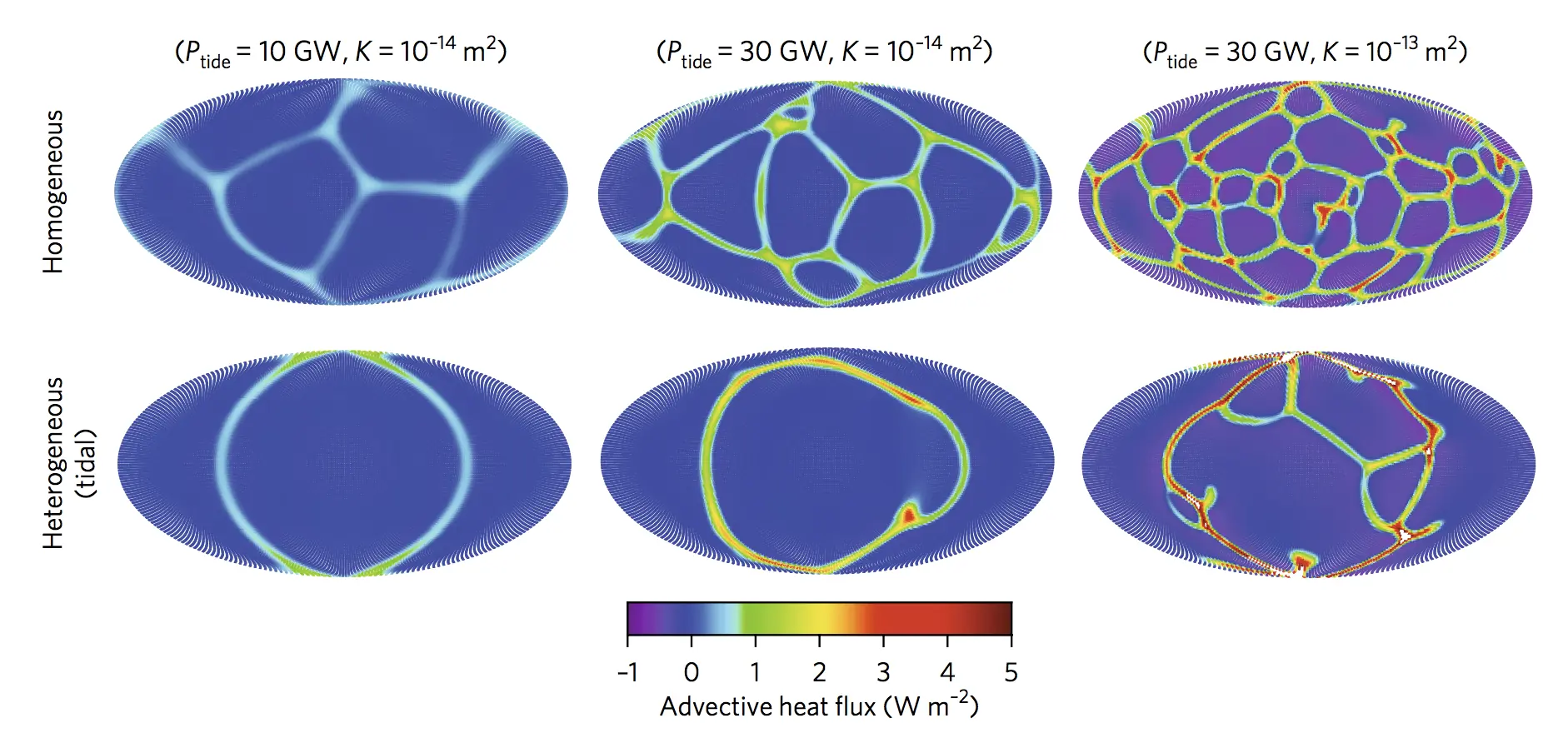 Patrón de calentamiento en la superficie entre el núcleo poroso y el océano de Encélado para un núcleo homogéneo (arriba) y otro heterogéneo.