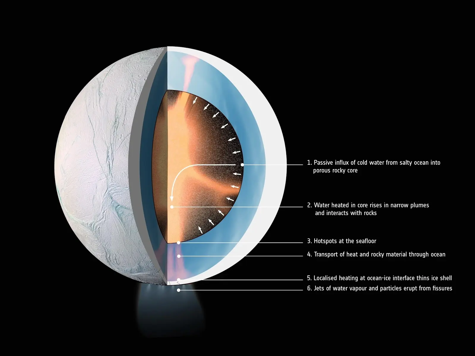 Incluyendo todo lo que sabemos y conocemos de Encélado, se añadió en nuevas simulaciones un núcleo formado por roca porosa deformable y no consolidada, en que el el agua podría filtrarse facilmente y calentarse gradualmente gracias al calor generado por la fricción de las mareas gravitatorias, que posteriormente transferirían dicho calor al océano superior en forma de estrechas columnas, que además de transportar partículas minerales, también se elevarían hasta la corteza helada, fundiéndola en parte y haciendo que fuera mucho más delgada. Esto no solo explicaría que se mantenga activa a lo largo de las eras, sino también pondría luz en la otra gran pregunta, el porque los géisers, la actividad externa que vemos en esta luna, está concertada de tal forma en el polo sur.