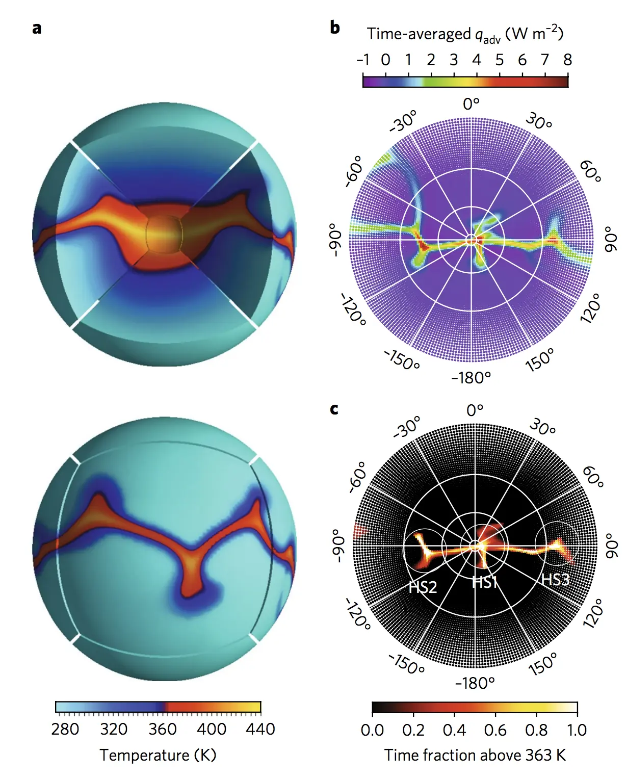 Zonas calientes del fondo del océano de Encélado producidas según este modelo. En b) y c) se ven las zonas calientes que han permanecido por encima de 90 ºC durante diez millones de años.