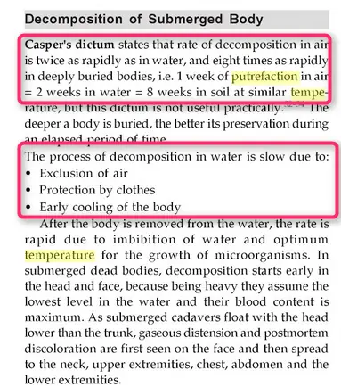 Así que me dí a la ardua taréa de buscar en libros el efecto de la temperatura en la descomposición de los cuerpos, el efecto de estar sumergido y que le sucede al cuerpo al congelarlo.