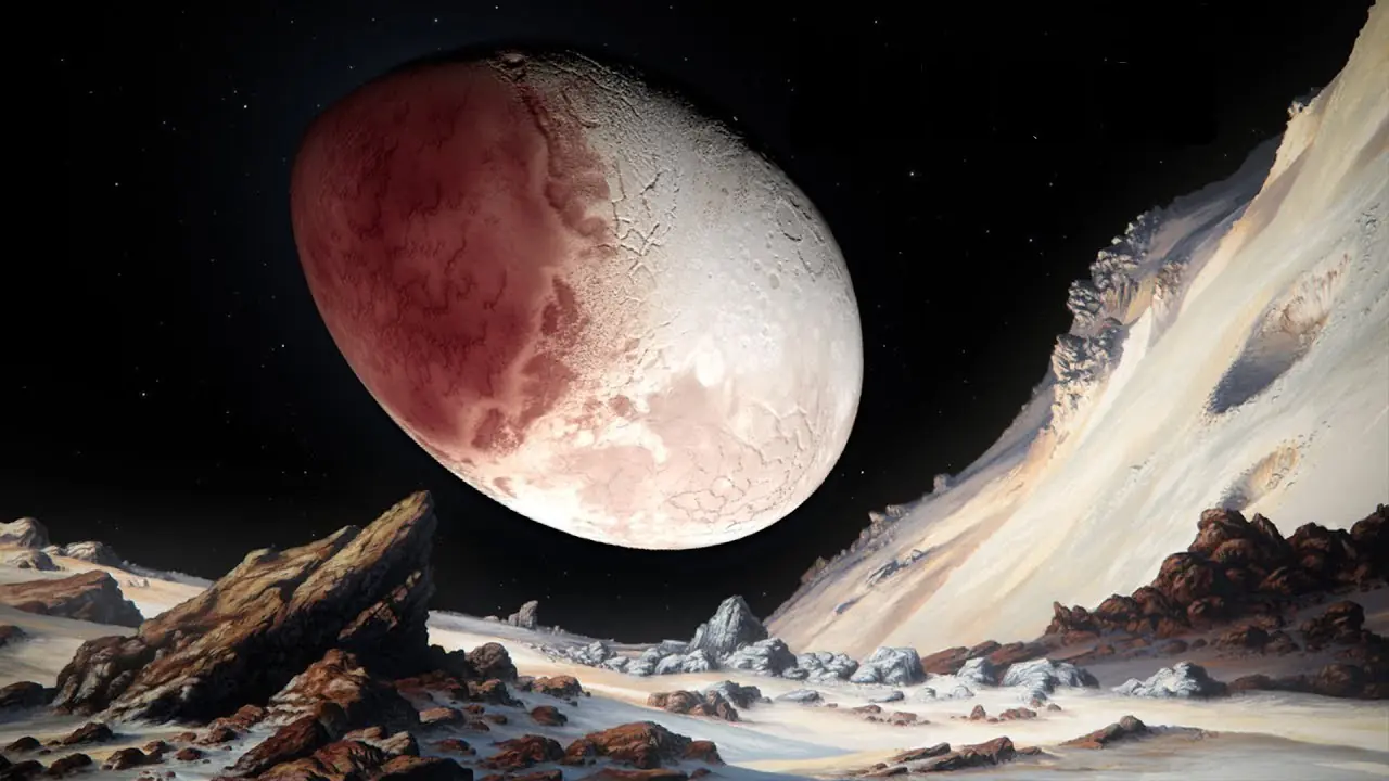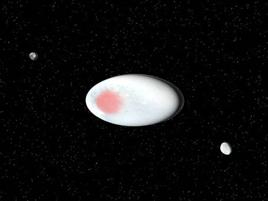 Y la última de ellas llega de uno de sus habitantes más extraños, Haumea, un planeta enano con una forma sorprendente (2300×1500×1000 km según las últimas estimaciones) para ser tan grande, un balón de rugby planetario que además es el cuerpo celeste del Sistema Solar con la rotación más rápida, algo menos de 4 horas, algo que en parte podría explicar su forma. Para complementar todo este cúmulo de rarezas, tiene dos pequeñas lunas, Namaka y Hiʻiaka, la primera de las cuales tiene una órbita excéntrica y elíptica que deberían haber sido suavizada hace tiempo por las mareas gravitatorias de su planeta madre, cosa que no es el caso. Quizá se formó recientemente, fruto de una colisión.