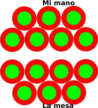 El centro verde es el núcleo, lo rojo el exterior (electrones), vemos que queda un espacio entre mi mano y la mesa por efecto de la repulsión. F