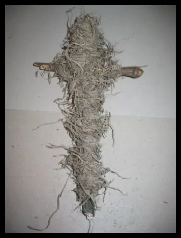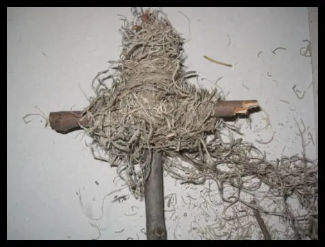 3. Colocar el musgo español alrededor de los palos, como "abrigandolos". Reforzar de esta forma el medio, y de ser posible pasarlo por todos lados. Tratar de que no se separe el musgo, que quede como un "todo unido". El orden es: Primero desde el medio donde esta atado, y subir alrededor de la cabeza, pasar por un brazo, la espalda y el otro brazo, la espalda y seguir para abajo.