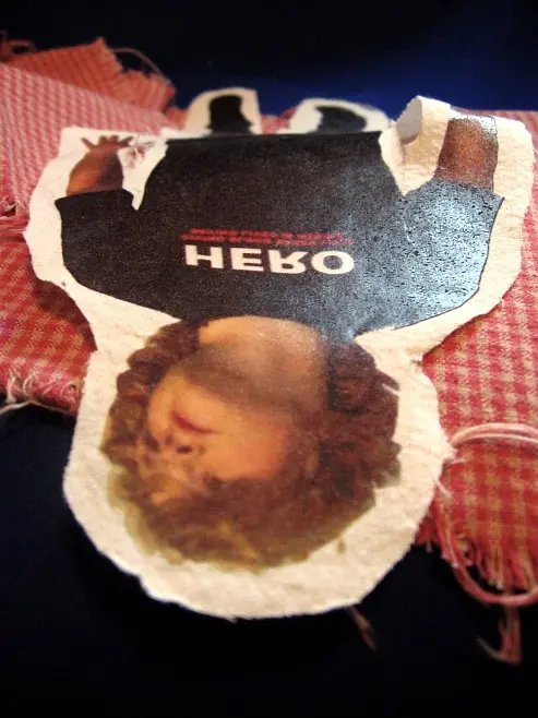 - Si hay cualquier texto o gráficos sobre la imagen (como en la persona de la foto) recordar invertir la imagen horizontalmente antes de imprimir de manera que más tarde aparezca normalmente, cuando este en el muñeco. Si lo prefiere, puede recortar un corazón de tela roja para cubrir esa sección en el muñeco.