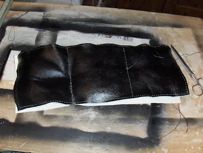 Perla de sabiduría: manejar el cuero mojado con unos guantes de látex puede ahorrarte un par de días de dedos negros. No sé con que demonios estaba curtido o teñido ese cuero, pero no conseguí sacarlo de mis manos ni con aguarrás, ni con alcohol de quemar, ni con quitamanchas concentrado ("evitar el contacto con la piel"