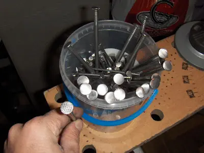 Remaches obtenidos de clavos de 5,5mm. Unos señores remaches, que requieren una radial para cortarlos con un mínimo de precisión. Se hace el taladro en el escudo, se pasa el clavo, se marca el punto de corte se saca, se corta, y se vuelve a introducir en su sitio para remacharlo (recuerda: arandela)