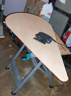 Sabemos lo que está pensando, señora: luego las dos láminas no van a cuadrar bien, la que esté en la parte interior de la curva va a sobresalir por los laterales. Sí, señora, tiene usted razón. Pero no es problema si dispone usted de una buena lijadora, que se encargará de rebajar e igualar los bordes a la perfección. Y si no tiene una lijadora ¡tampoco importa! Puede usted curvar las láminas rectangulares y cortar la forma del escudo más adelante; pero nosotros nos preocupamos por usted, y no se lo recomendamos, porque entonces los bordes del escudo es más que probable que queden mal pegados entre sí; y además la sierra de calar no es tan sencilla de manejar en una superficie curva.
