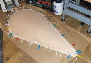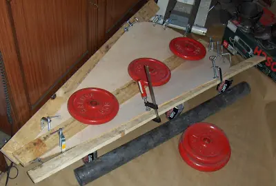Paso 4. Colocamos la tercera tabla encima del invento, bien centradita, le ponemos unos pesos encima y ¡tachán! ¡El escudo se curva! Nos aseguraremos de que las dos planchas estén bien alineadas (luego no podremos cambiarlo) y fijaremos todo el perímetro con mordazas, para garantizar que queden bien unidas.