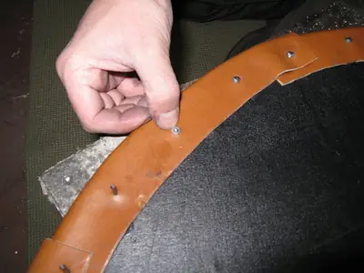 Es mucho más fácil clavetear directamente el cuero al escudo, con el relleno dentro; algo que, al fin y al cabo, vas a hacer de todas formas.