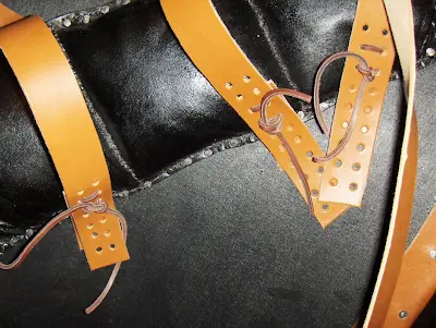 Una vez fijado el relleno, hay que colocar las correas del embrace. Yo utilicé tiras de 3,5cm de ancho, obtenidas del mismo cuero que empleé para el canteado.