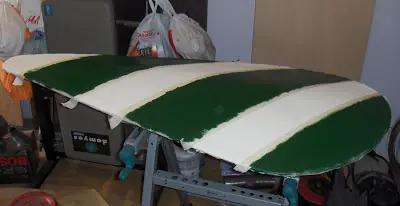 Yo acabé pintando todo el interior de negro uniforme, y el exterior con franjas verdes y blancas (blanco pergamino, lo llaman) Por cierto, si el diseño es rectilíneo, no desperdiciéis la oportunidad de emplear cinta de carrocero. Ahorrará mucho trabajo de perfilado cuidadoso con un pincel fino; y puedes pegarla perfectamente sobre lo que ya has pintado (si está seco, claro) que no se llevará pintura.