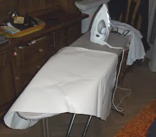 MAL: Usar pinzas para sujetar la tela en su sitio. Deja unas marcas muy raras, arrugas, y, sobre todo, deja toda la tela pegada por el otro lado del escudo. Sí éste es el método que yo usé.