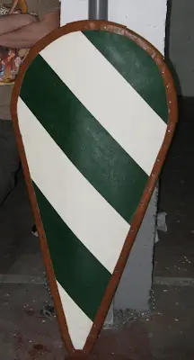 Harán falta dos (y hasta tres) capas de pintura para cubrir bien la tela. Lo habitual en este tipo de escudo es seguir diseños geométricos simples: a bandas, mitad y mitad, cuadrantes, cruces… Parece ser que lo más sofisticado de lo que hay constancia en cuanto a decoración de este tipo de escudos son los animales de algunos escudos (muy pocos) del tapiz de Bayeux; Cuando se empezaron a usar emblemas heráldicos, los escudos ya lágrima habían pasado de moda.