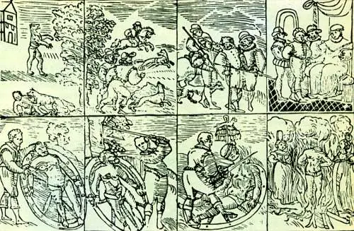 Escenas de la vida de Peter Stump, hombre-lobo alemán de triste memoria que actuó en los escenarios de Colonia, según un grabado del siglo XVI.