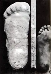 Molde de una huella en yeso del Bigfoot que fue filmado en 1967 en Bluff Creek, California por Patterson. Después de la aparición del ser, dejó en el lugar numerosas pisadas que fueron posteriormente sacadas en molde. Obsérvese el descomunal tamaño de la huella la cual mide unos 40 cm, en comparación del pie de un ser humano que tan sólo mide unos 25 cm.